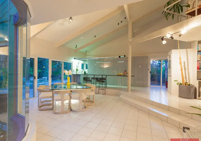It certainly is something very different and interesting, big open plan and split level to the impressive kitchen where all the appliances are hidden behind full-height 2pac cupboard doors and lovely sweeping granite bench top and trendy over head row of lights.
