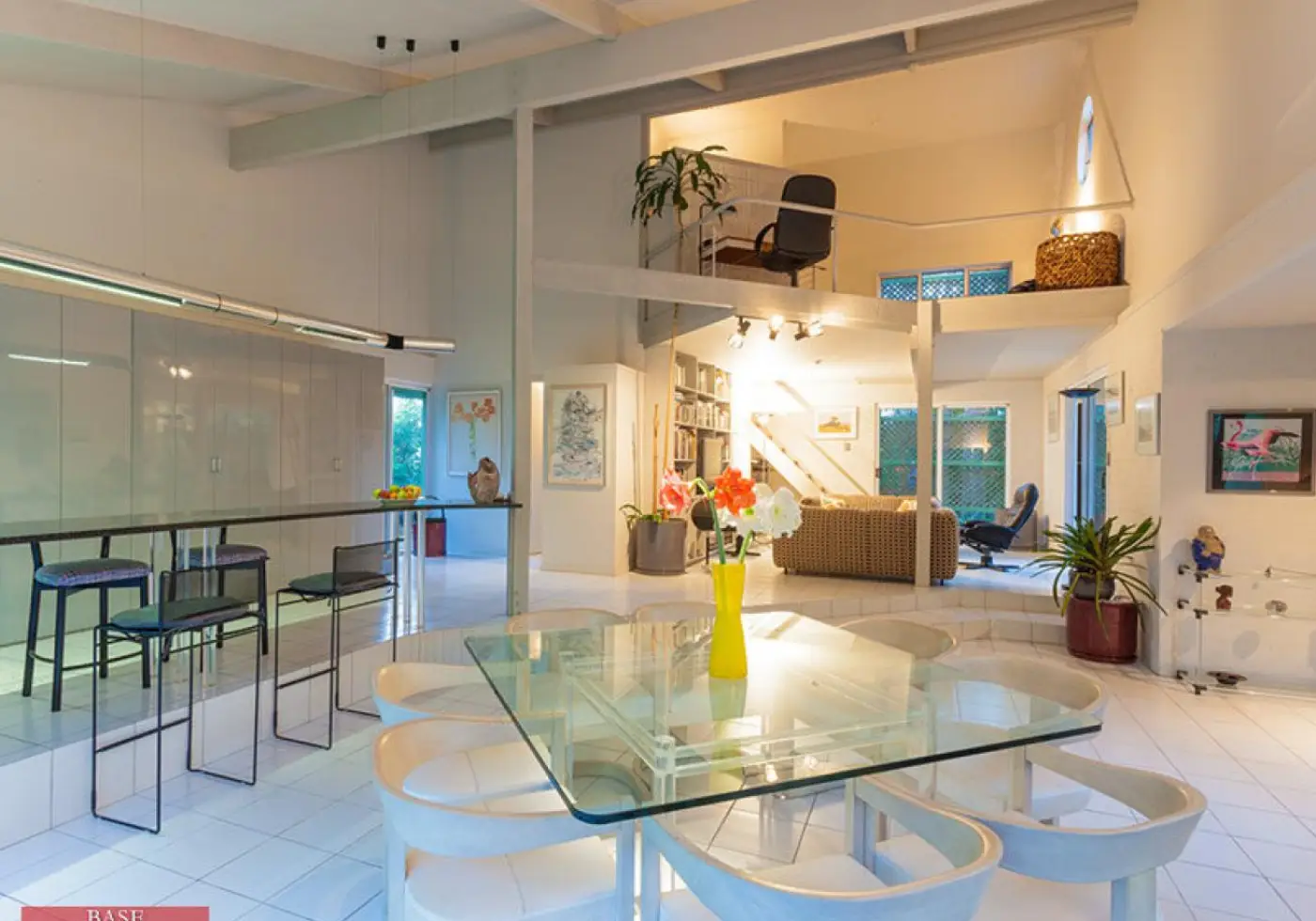 Off this bedroom is a dressing room and ensuite, computer station, and views down over the dining room and kitchen.