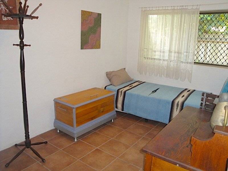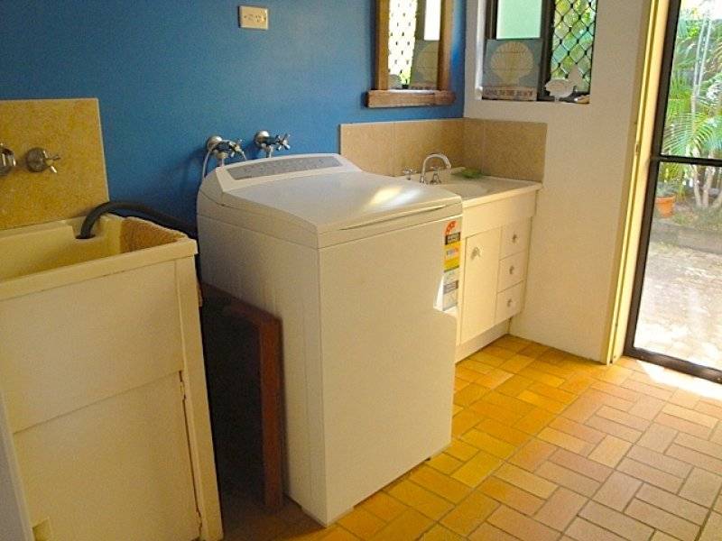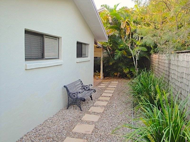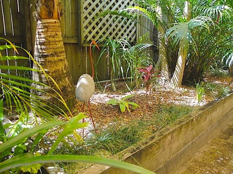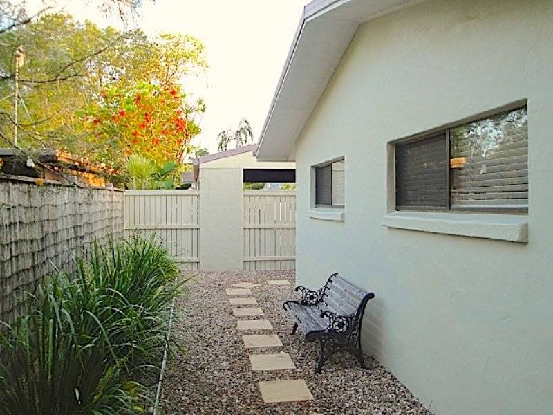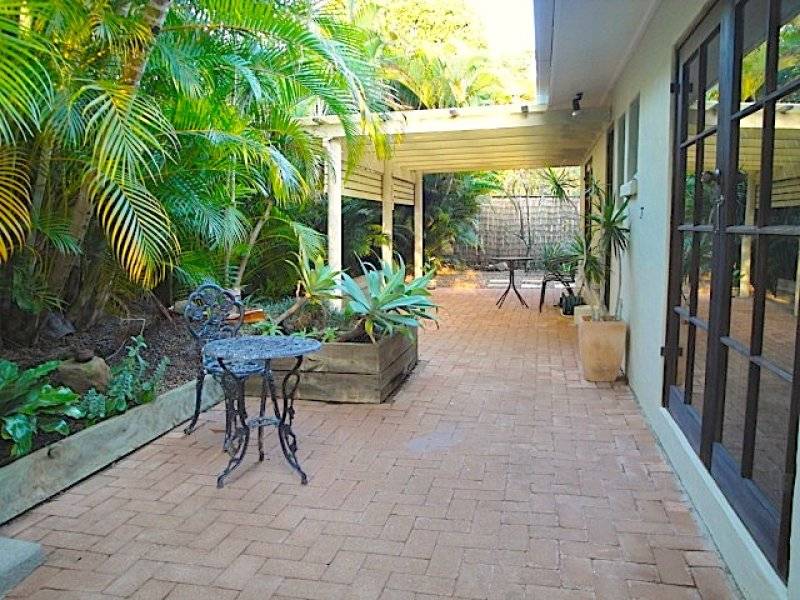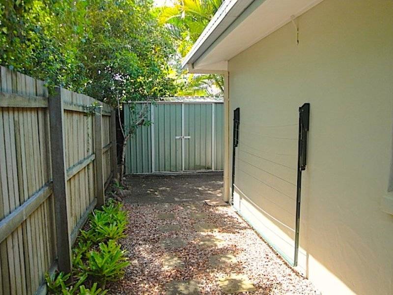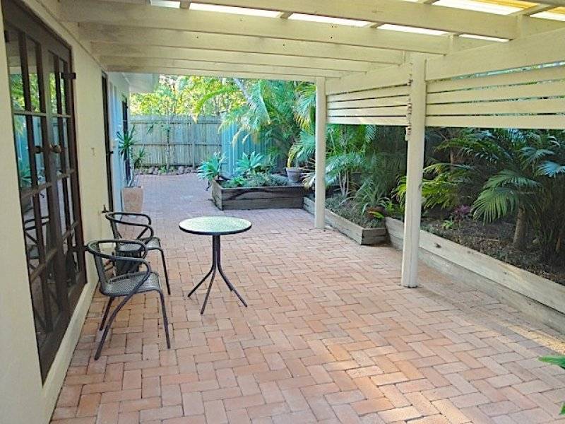 The attractive outside low maintenance entertaining area has a lovely tropical garden with an all weather storage shed.