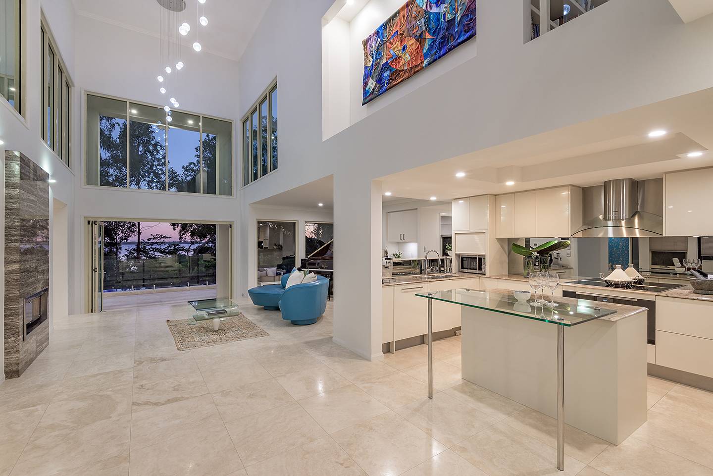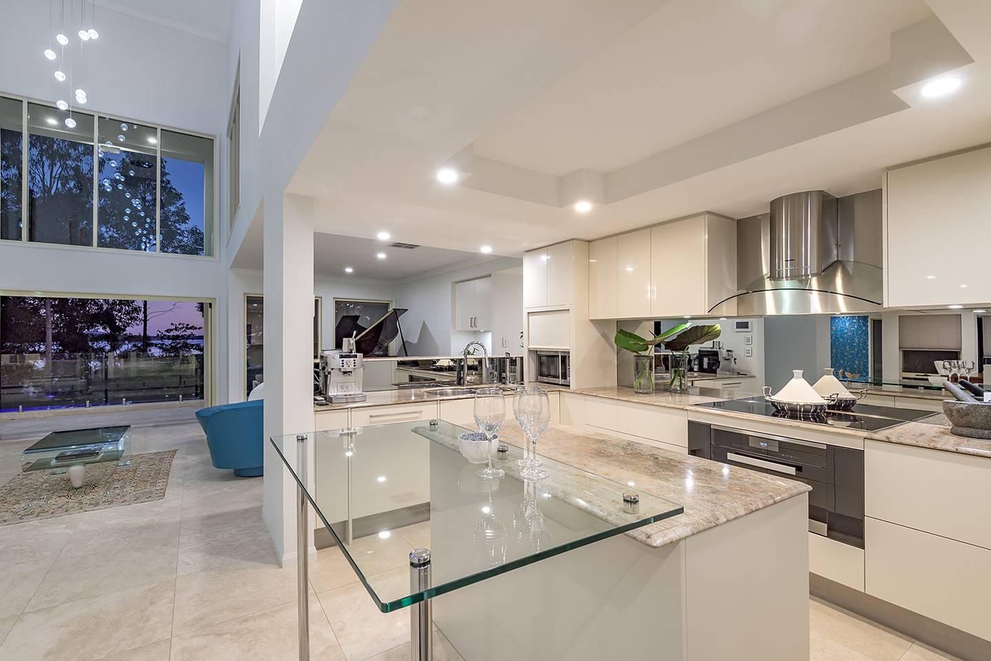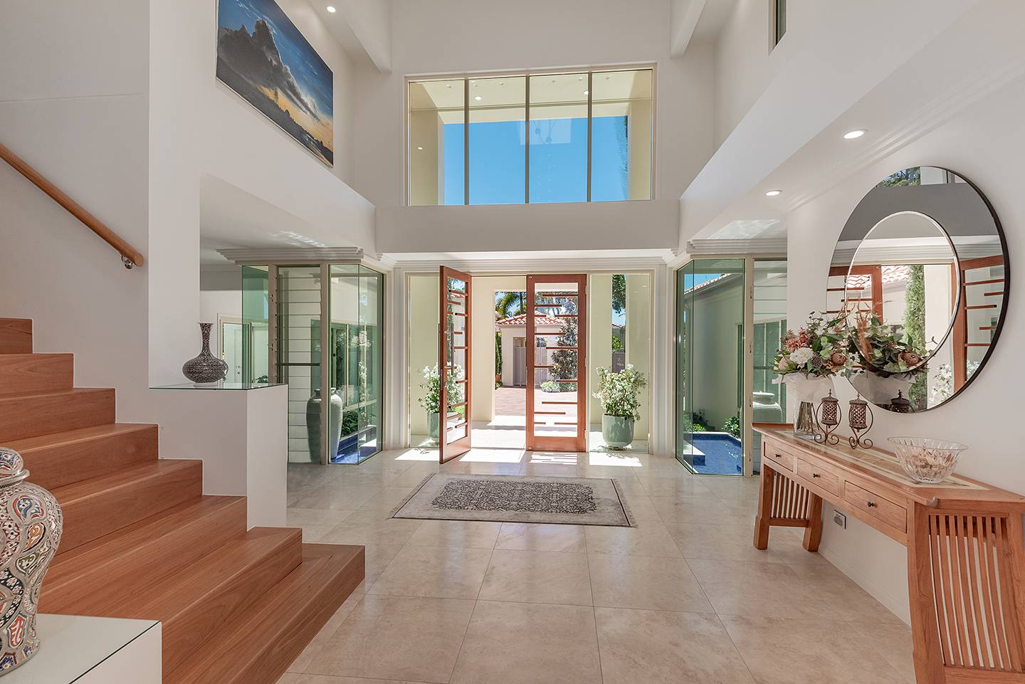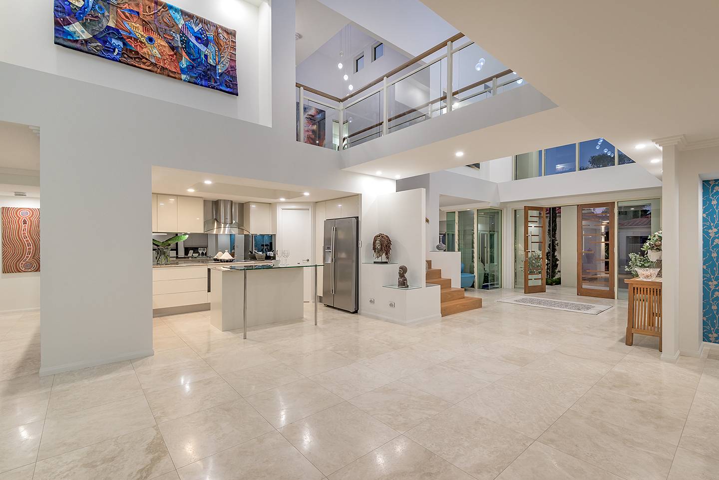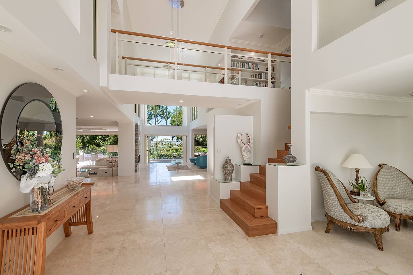 When you walk through the feature doors you are greeted with a massive atrium which follows right through the centre of this amazing home and then eye-catching views of Lake Weyba in front of you.  The atrium is spanned by a walkway that connects two beautiful upstairs bedrooms complete with unsuited bathroom and large viewing terraces where you can enjoy your morning coffee. The feature lighting is something else, it's perfectly designed for this breathtaking home.