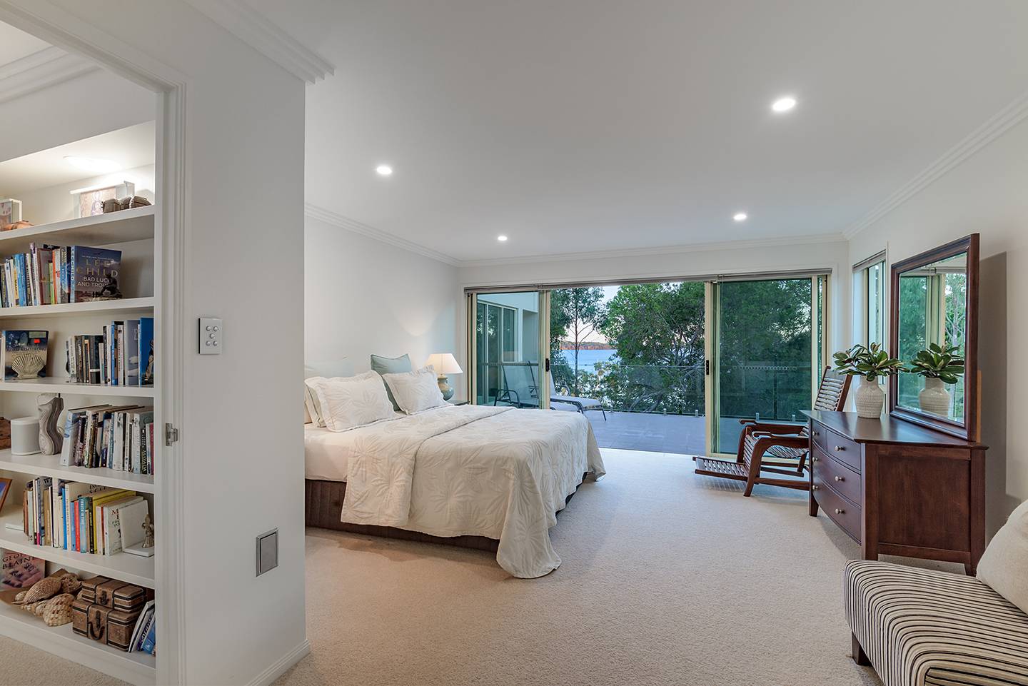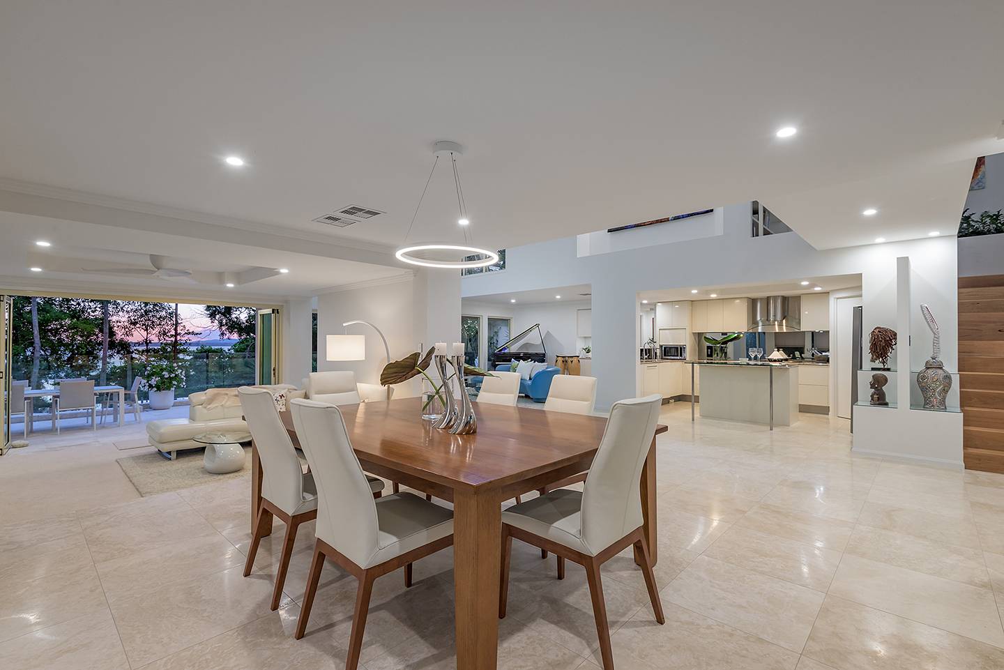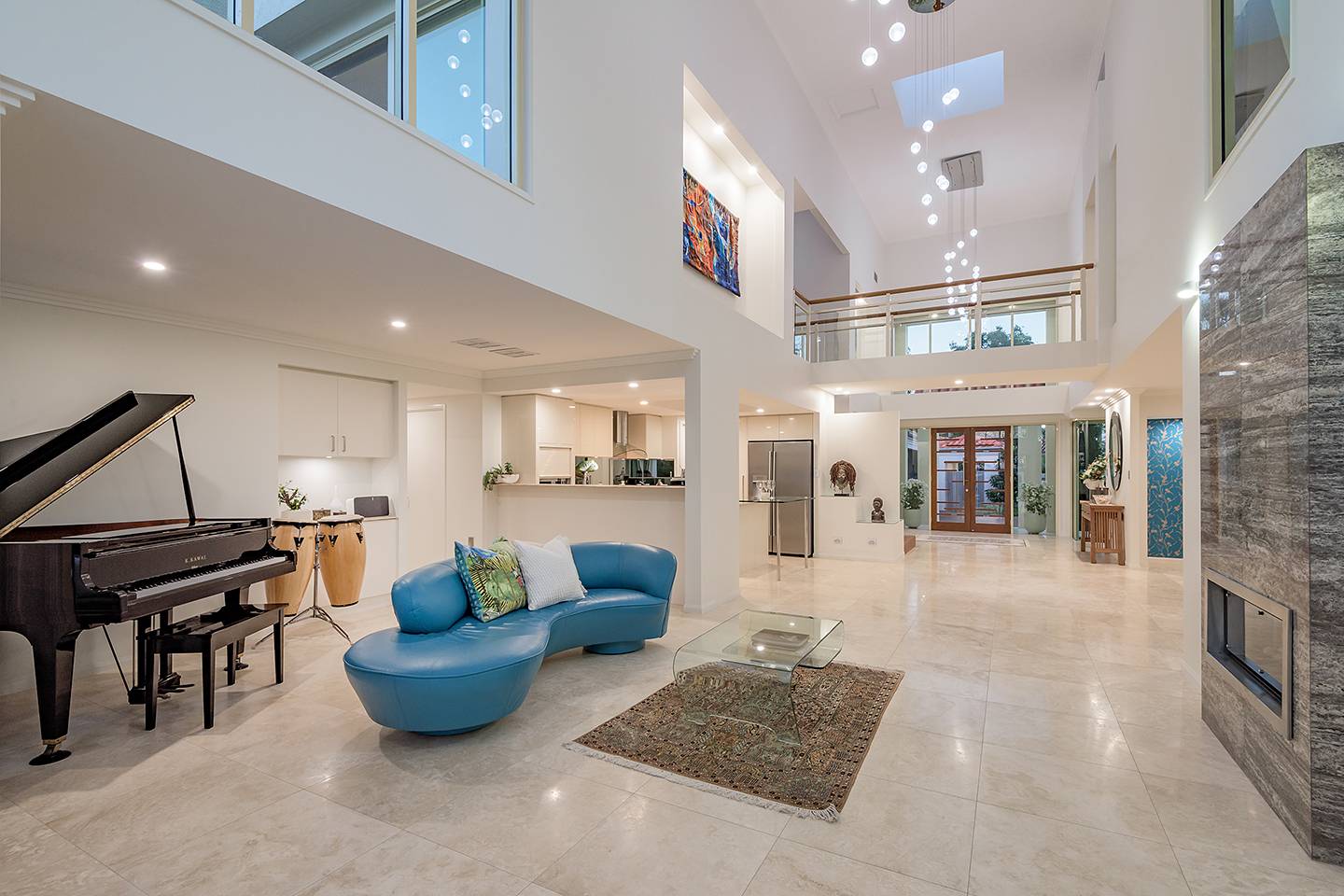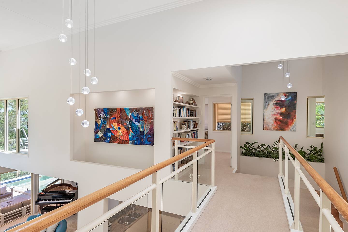 When you walk through the feature doors you are greeted with a massive atrium which follows right through the centre of this amazing home and then eye-catching views of Lake Weyba in front of you.  The atrium is spanned by a walkway that connects two beautiful upstairs bedrooms complete with unsuited bathroom and large viewing terraces where you can enjoy your morning coffee. The feature lighting is something else, it's perfectly designed for this breathtaking home.