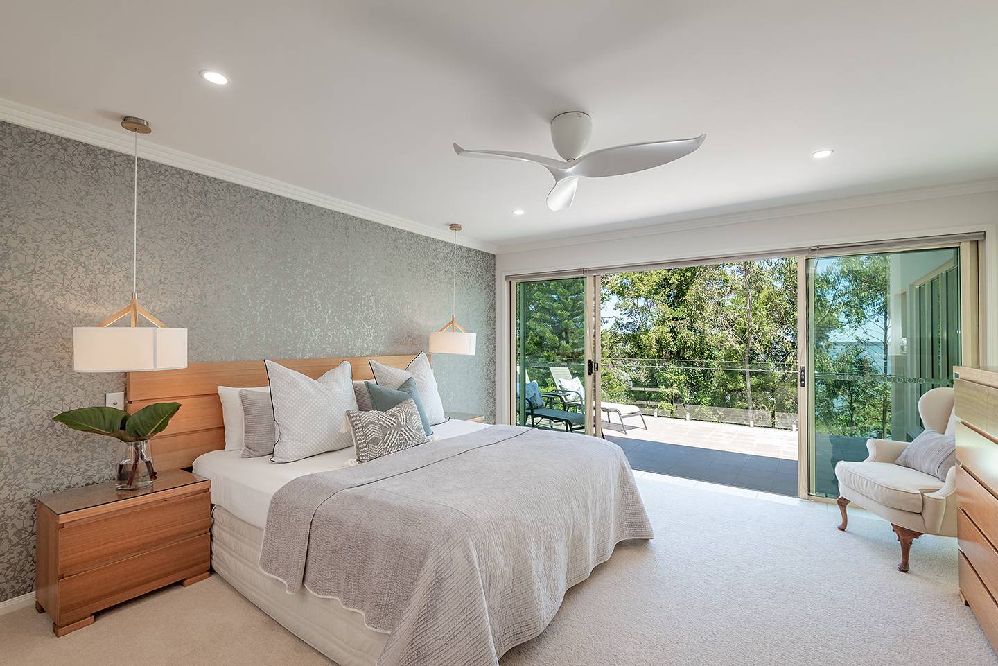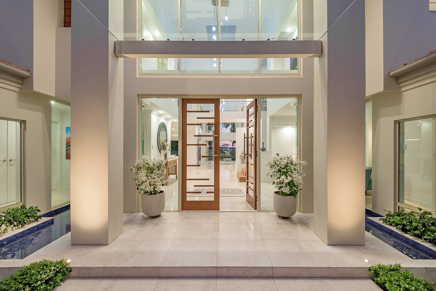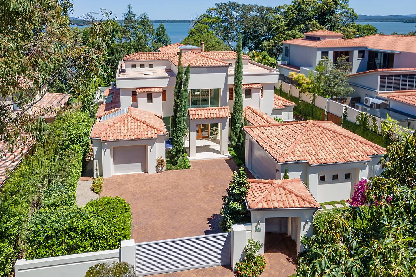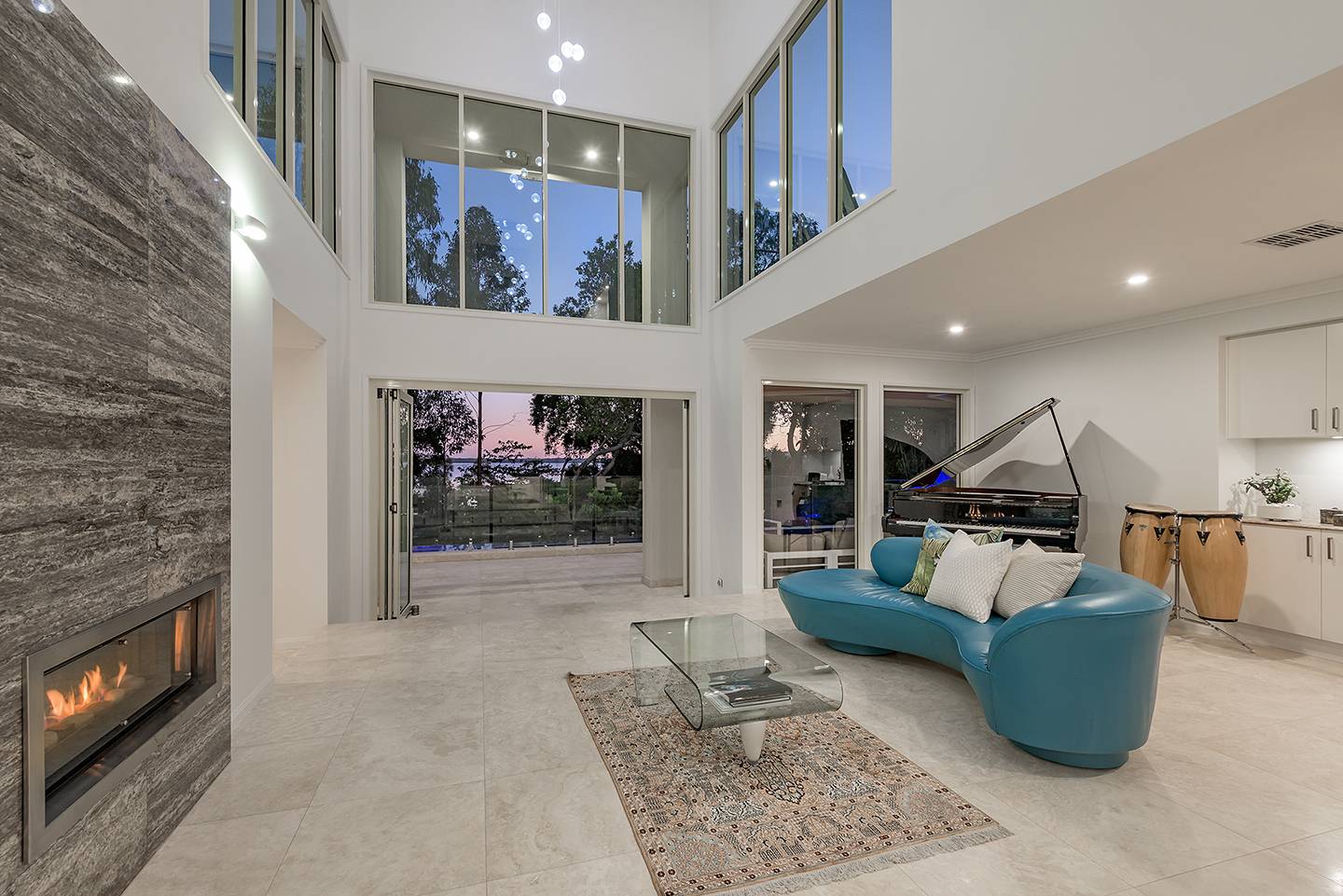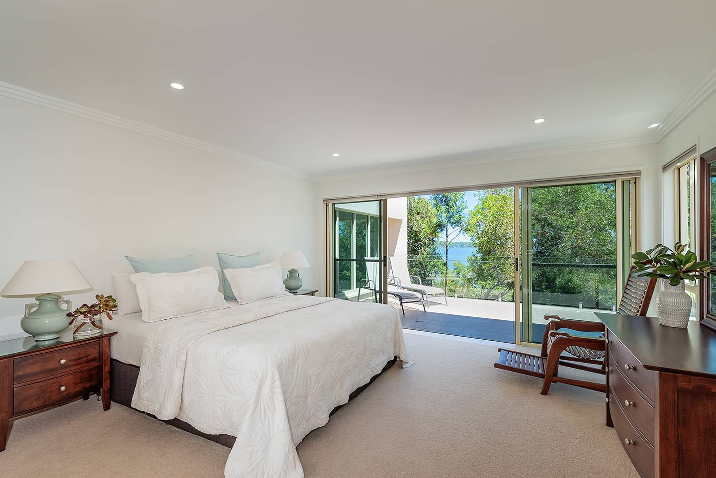 When you walk through the feature doors you are greeted with a massive atrium which follows right through the centre of this amazing home and then eye-catching views of Lake Weyba in front of you.  The atrium is spanned by a walkway that connects two beautiful upstairs bedrooms complete with unsuited bathroom and large viewing terraces where you can enjoy your morning coffee. The feature lighting is something else, it's perfectly designed for this breathtaking home.