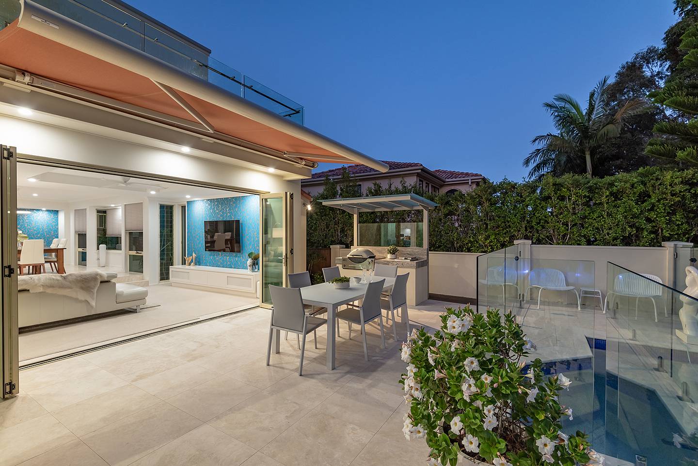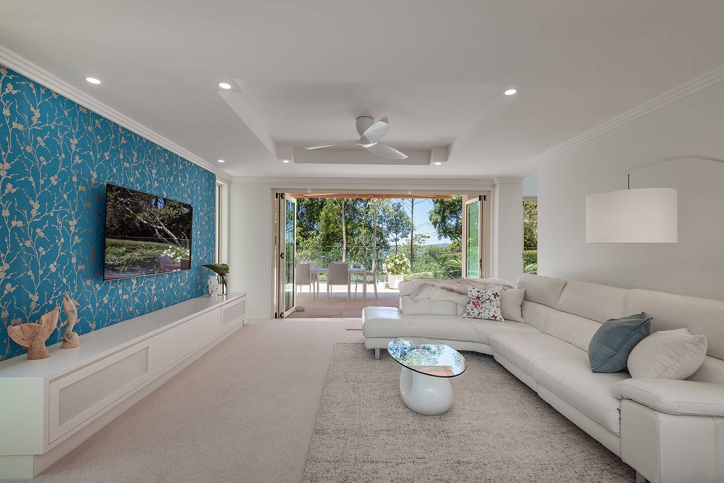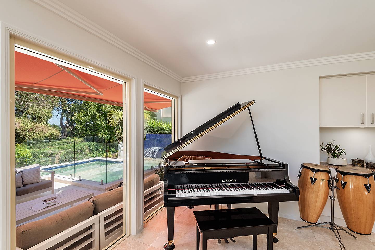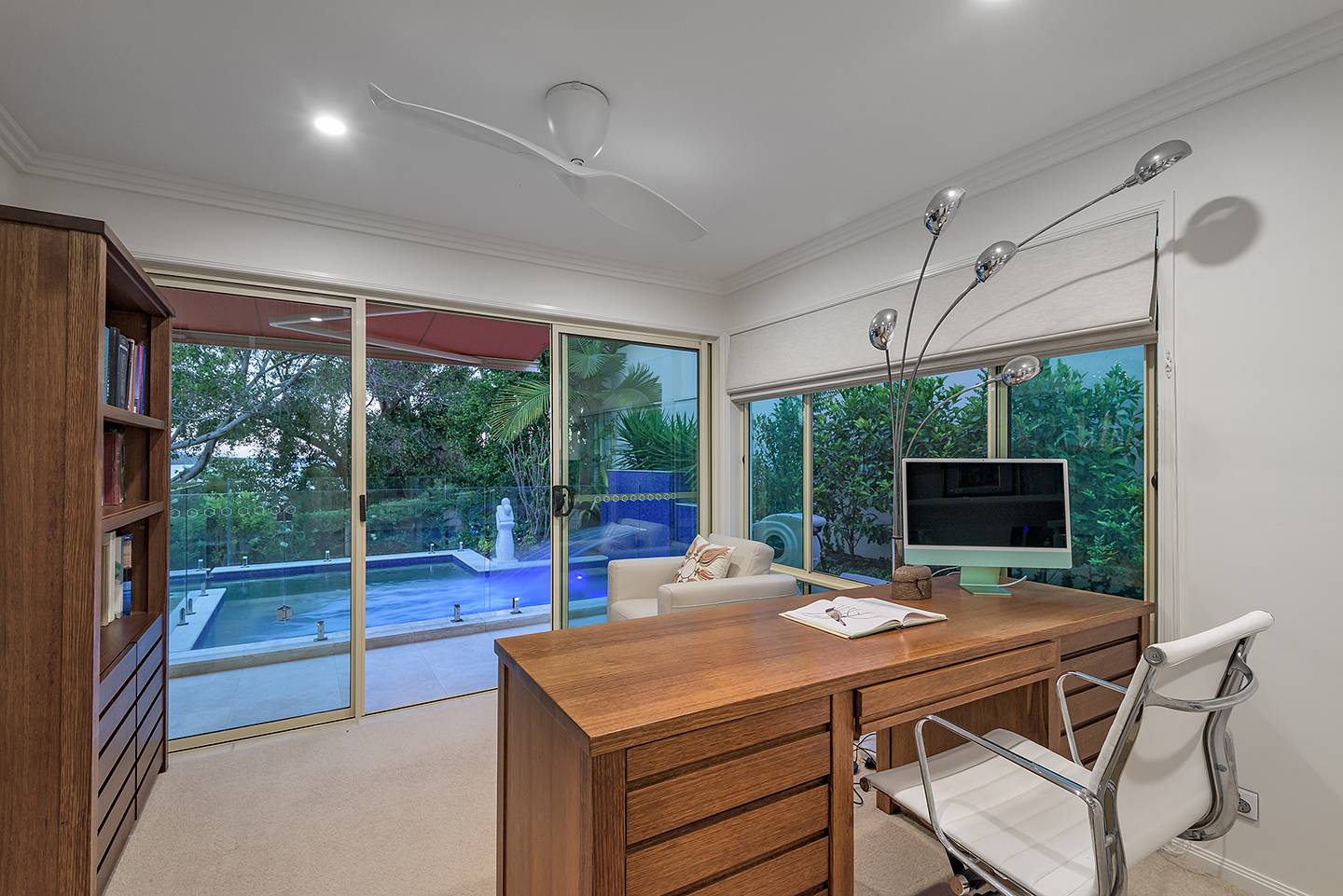 The intimate lounge or second TV room is tucked away and has a wonderful view out to the patio, pool and Built-in BBQ area.