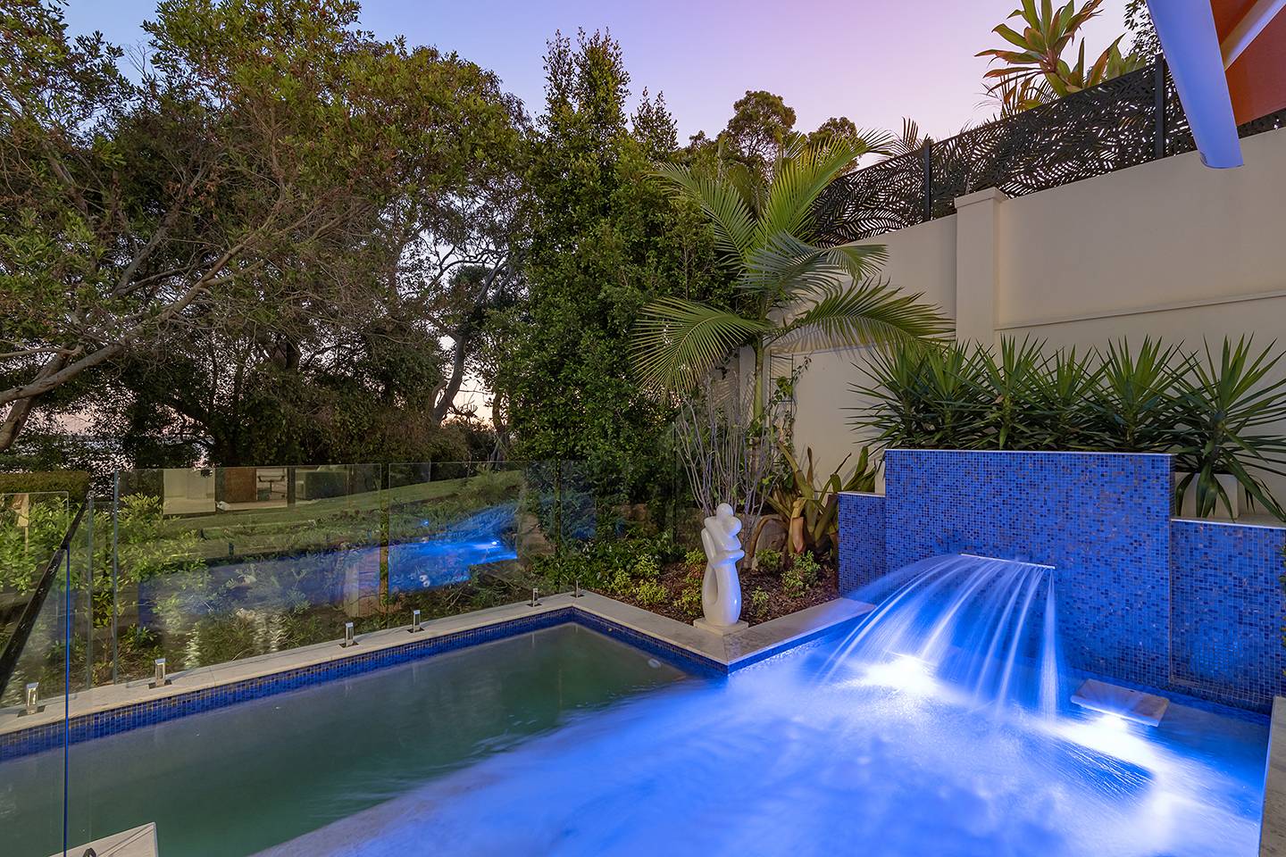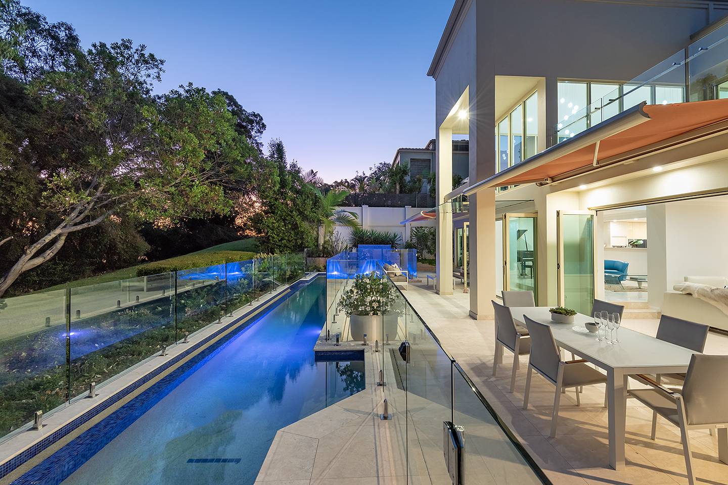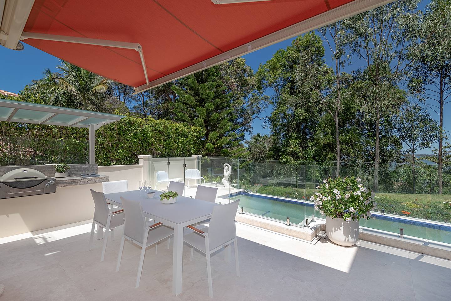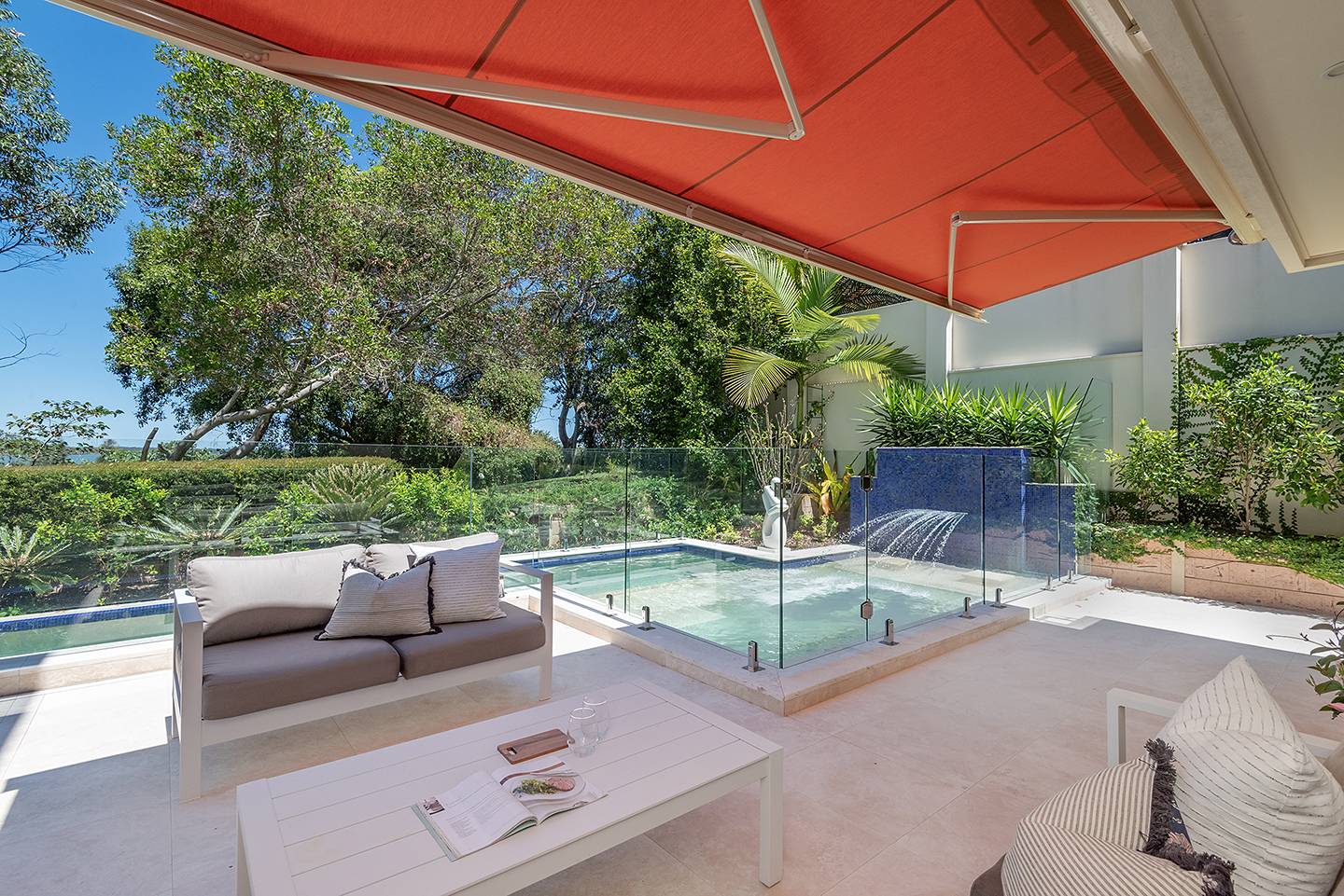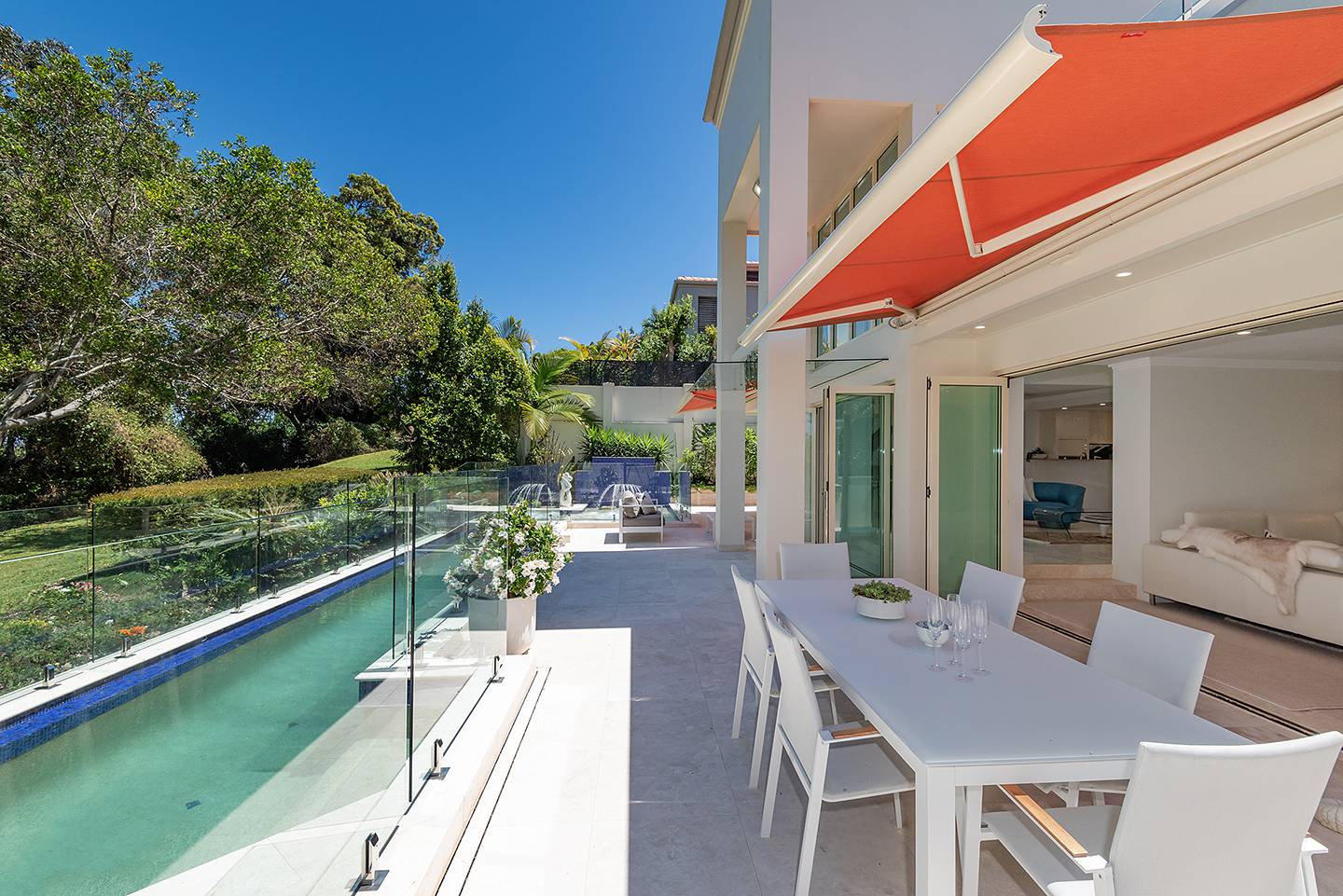 The intimate lounge or second TV room is tucked away and has a wonderful view out to the patio, pool and Built-in BBQ area.