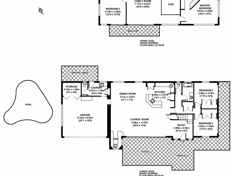 The upper level of the home has its own office and lounge, leading to the deck, as well as two large private ensuited bedrooms. Below there is yet again another lounge, bar, dining, kitchen, 3 large bedrooms and bathroom.