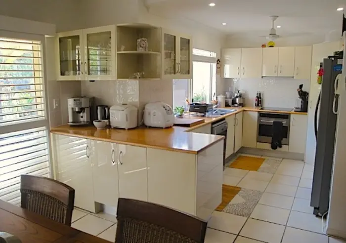 This lovely Villa Comprises: a choice of two master bedrooms, one up stairs and one on the ground floor, two lovely ensuites, powder room, study area, fans, air-conditioning throughout, tiled floors throughout the living areas, high ceilings, and here's a kitchen for keen cooks......big & spacious with plenty of cupboards in 2 pac finish, new hot plates, rangehood and dishwasher.